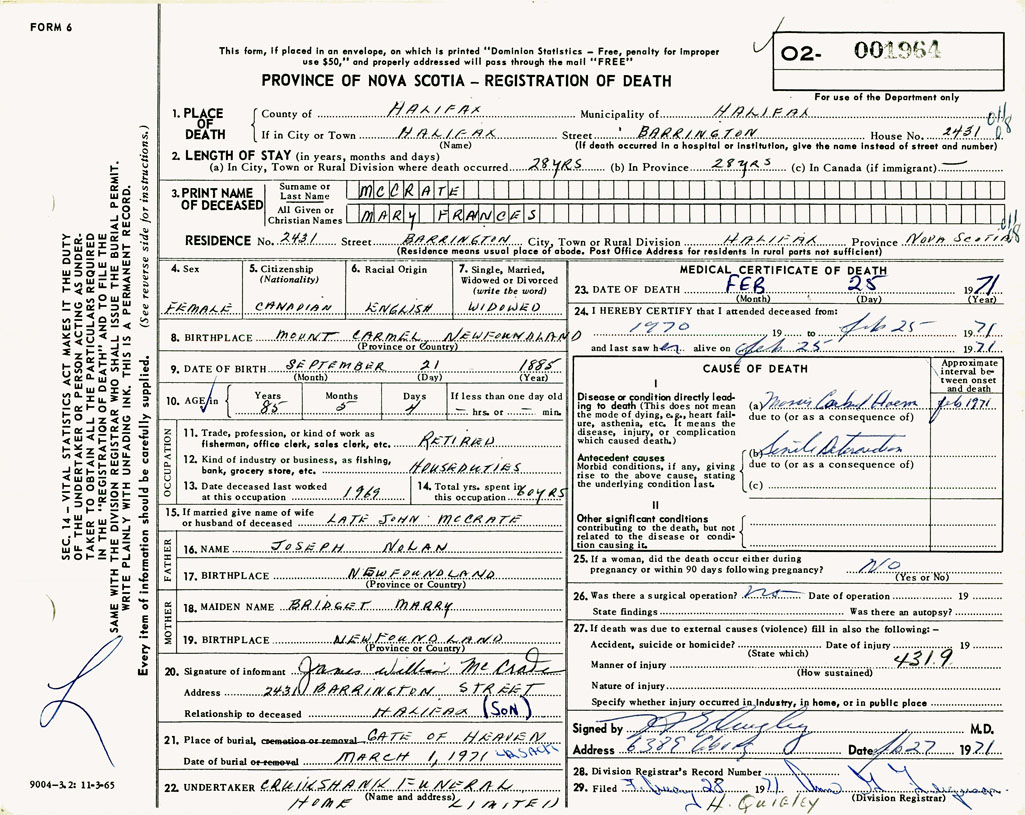 PROVINCE OF NOVA SCOTIA — REGISTRATION OF DEATH