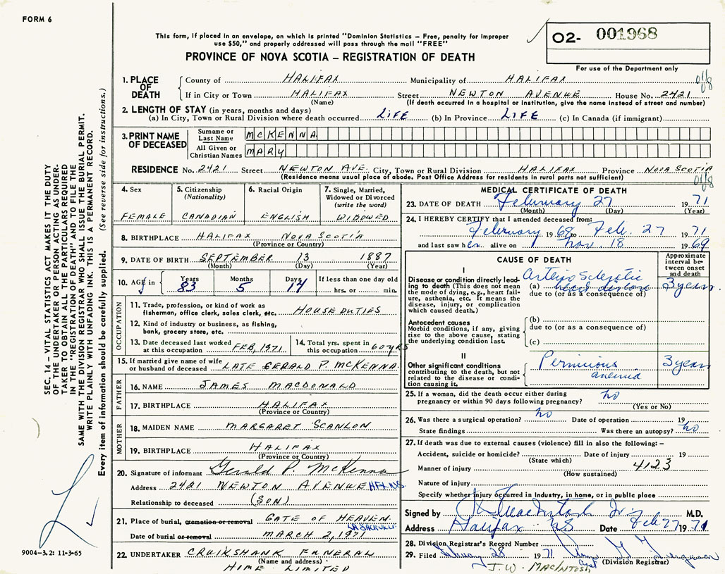 PROVINCE OF NOVA SCOTIA — REGISTRATION OF DEATH
