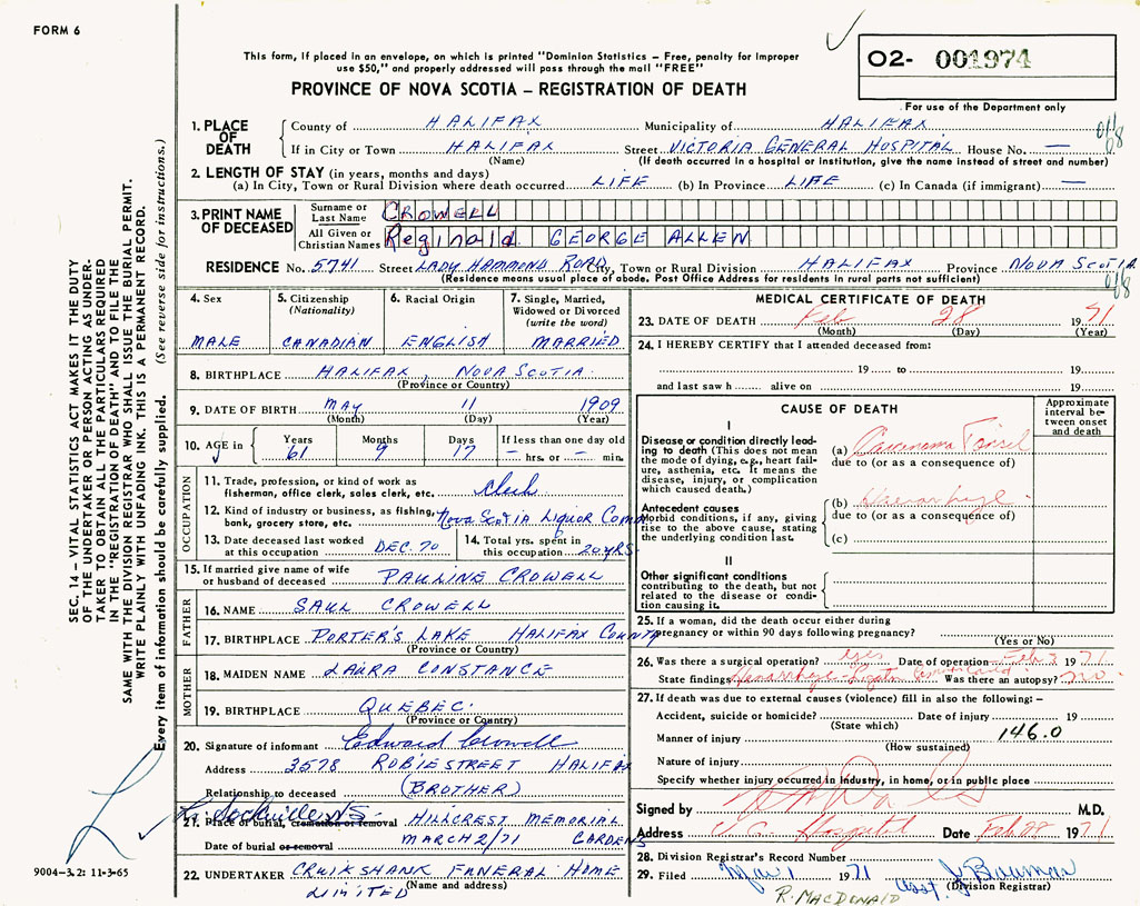 PROVINCE OF NOVA SCOTIA — REGISTRATION OF DEATH