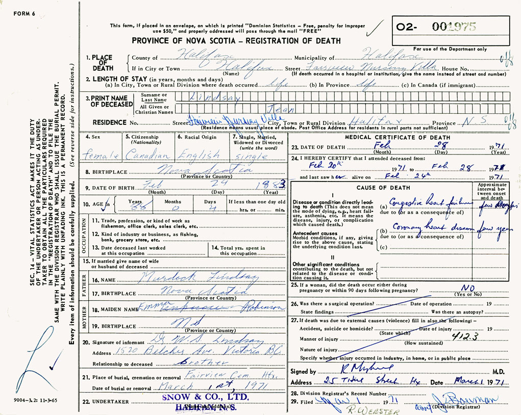 PROVINCE OF NOVA SCOTIA — REGISTRATION OF DEATH