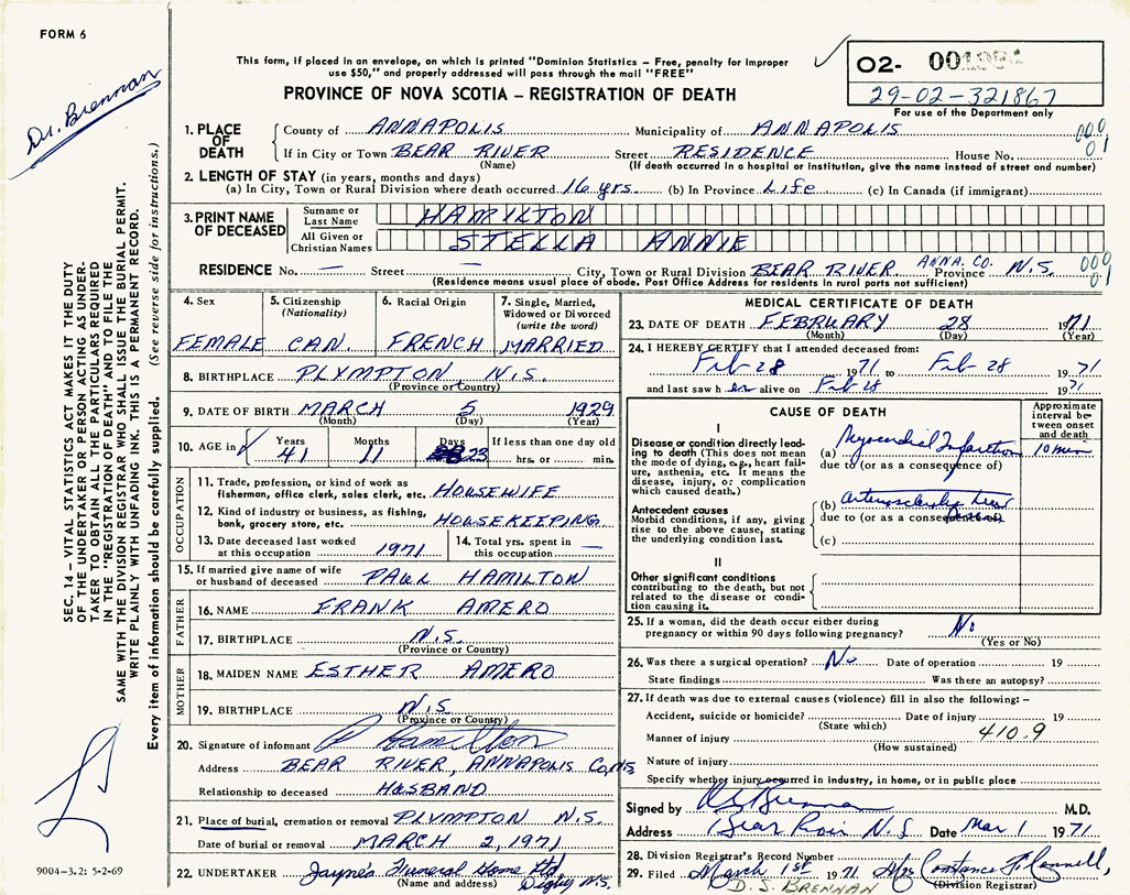 1. PLACE OF DEATH County of Annapolis If in City or Town Bear River
