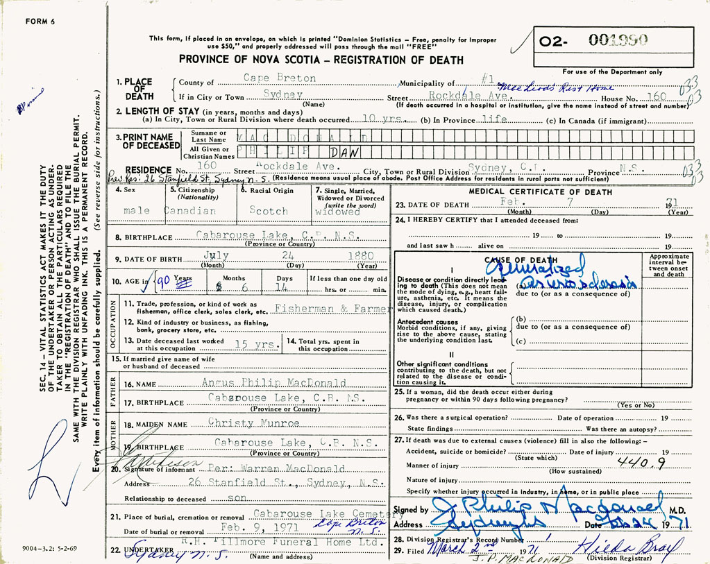 PROVINCE OF NOVA SCOTIA — REGISTRATION OF DEATH