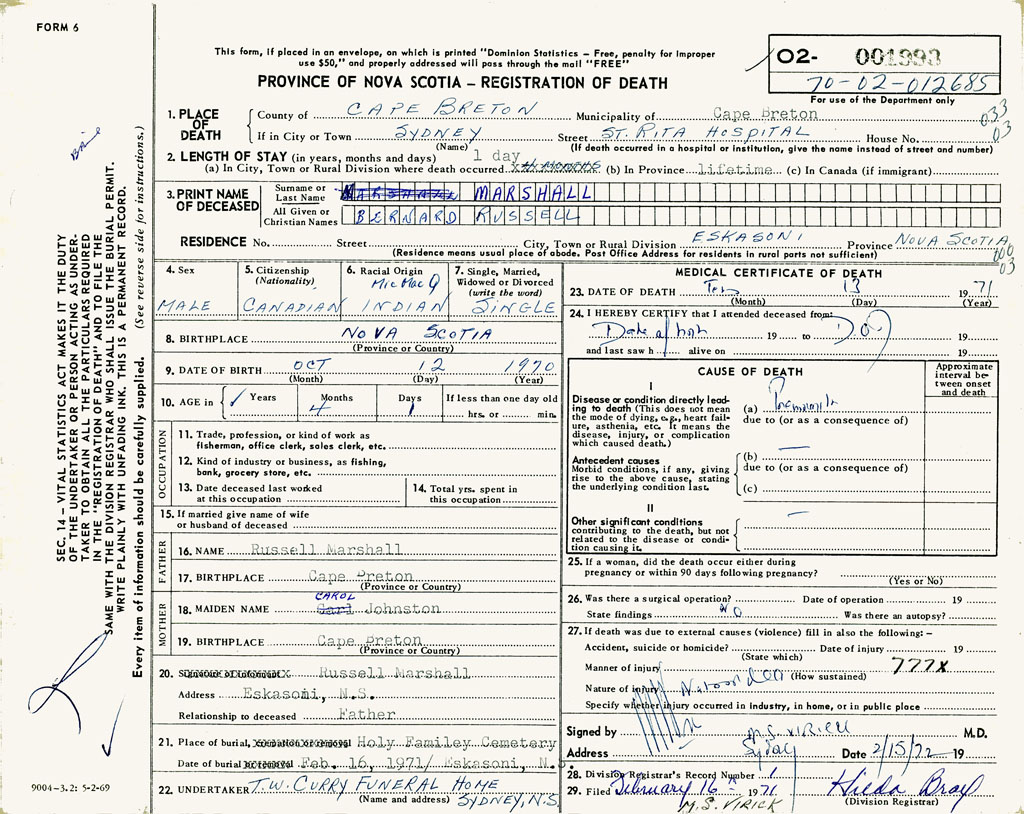 1. PLACE OF DEATH County of Cape Breton If in City or Town Sydney