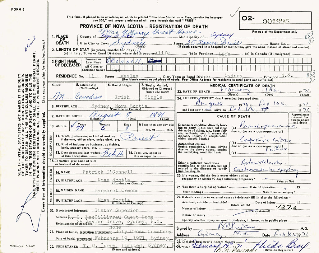 21. Place of burial Holy Cross Cemetery, Sydney, NS