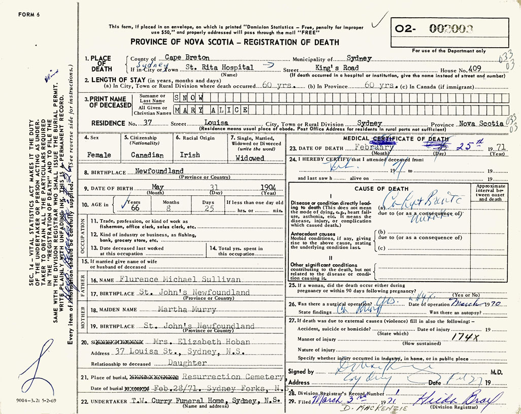 PROVINCE OF NOVA SCOTIA — REGISTRATION OF DEATH