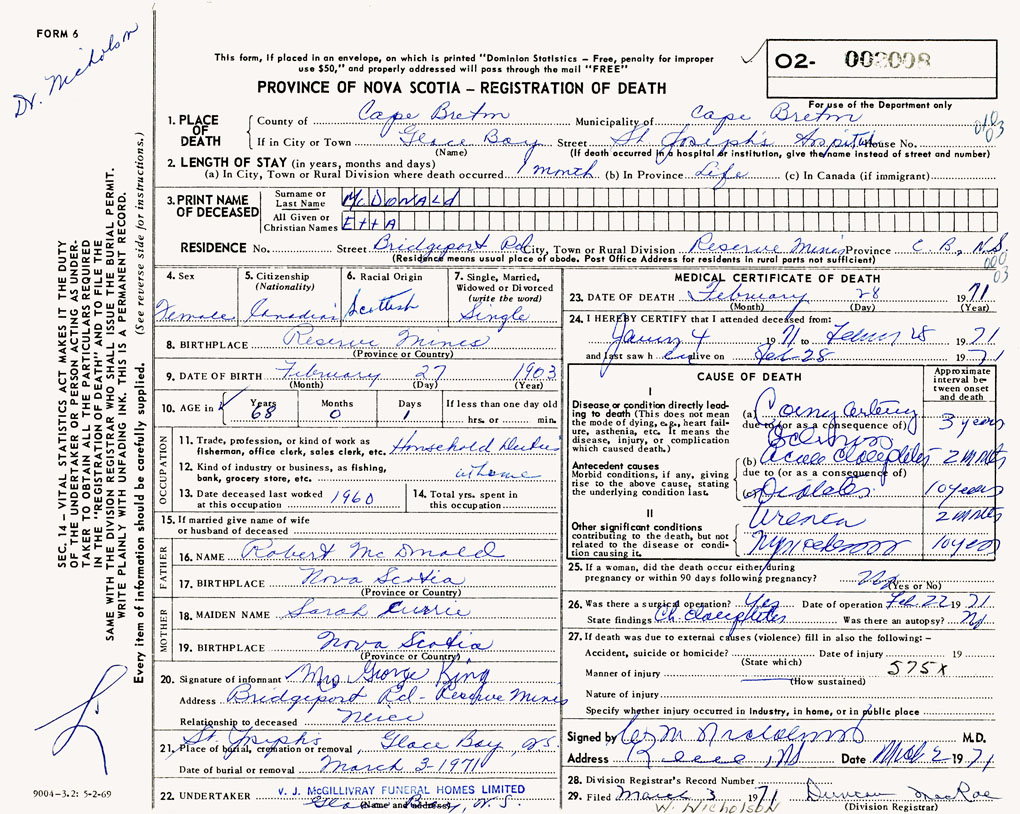 1. PLACE OF DEATH County of Cape Breton If in City or Town Glace Bay