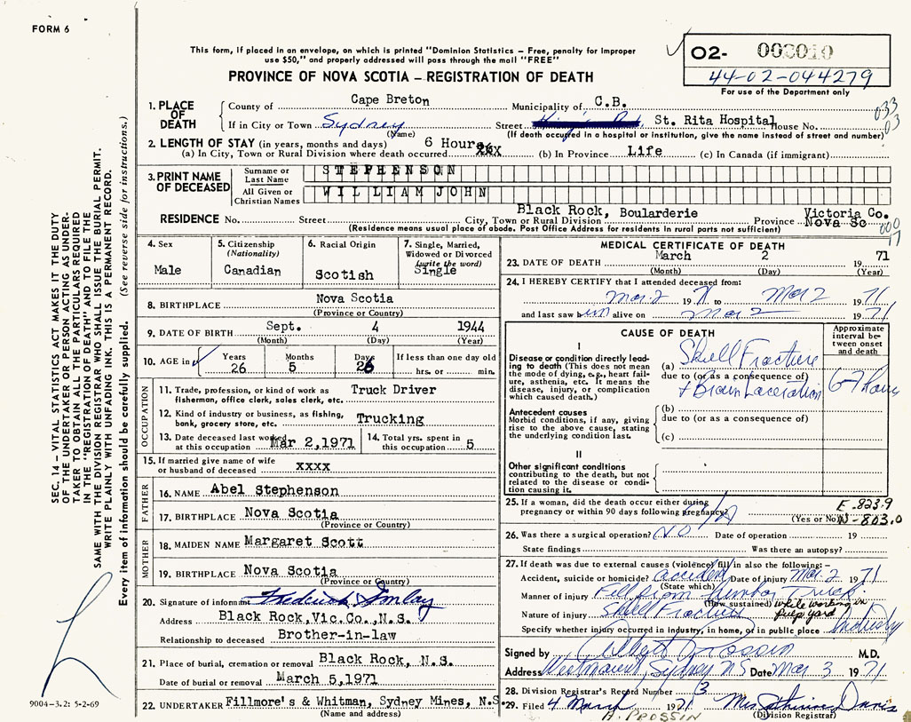 PROVINCE OF NOVA SCOTIA — REGISTRATION OF DEATH