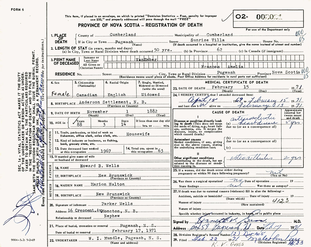 1. PLACE OF DEATH County of Cumberland If in City or Town Pugwash