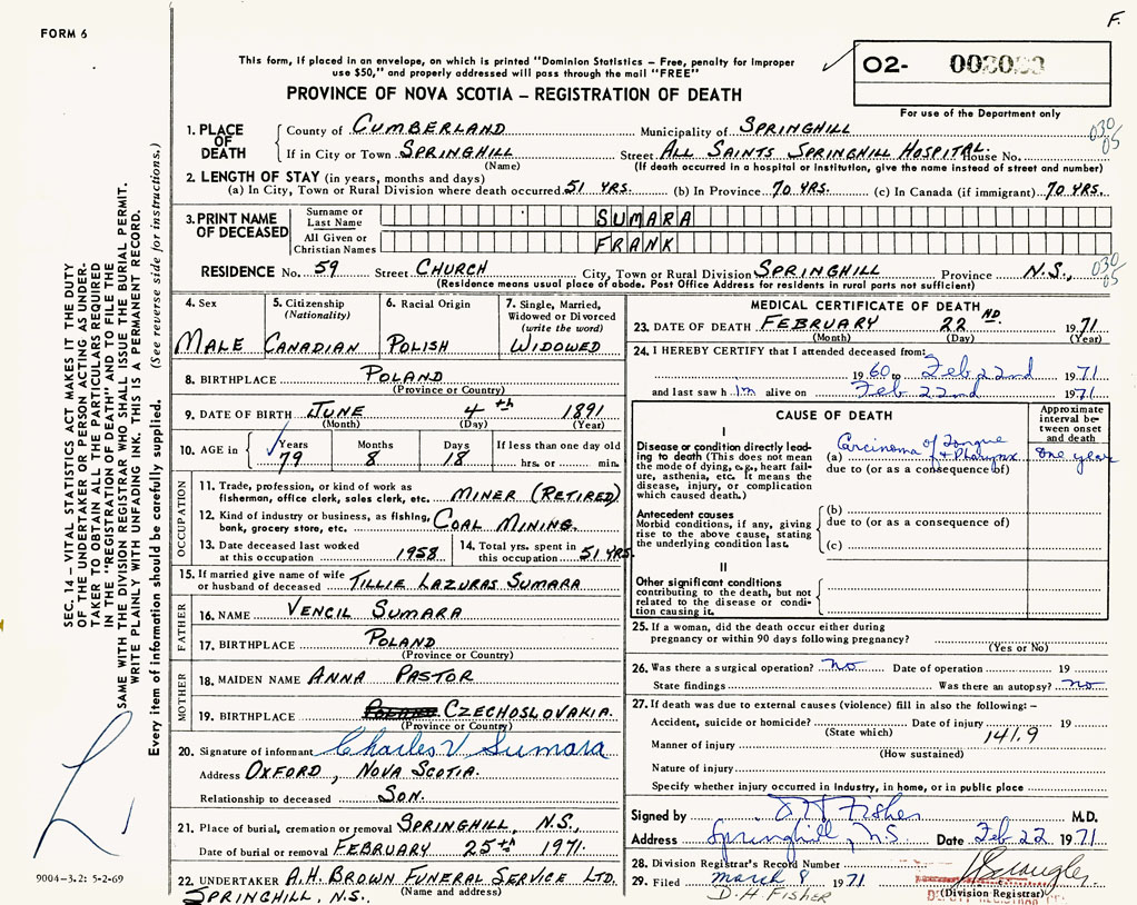 21. Place of burial Springhill, NS