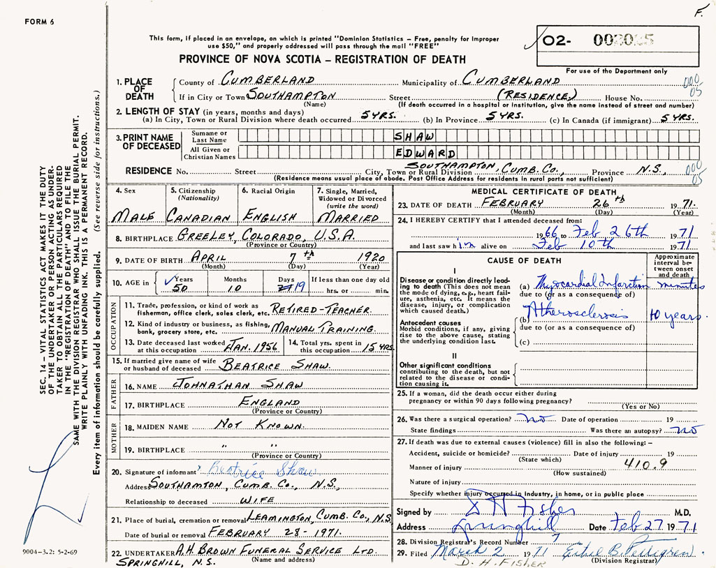 PROVINCE OF NOVA SCOTIA — REGISTRATION OF DEATH