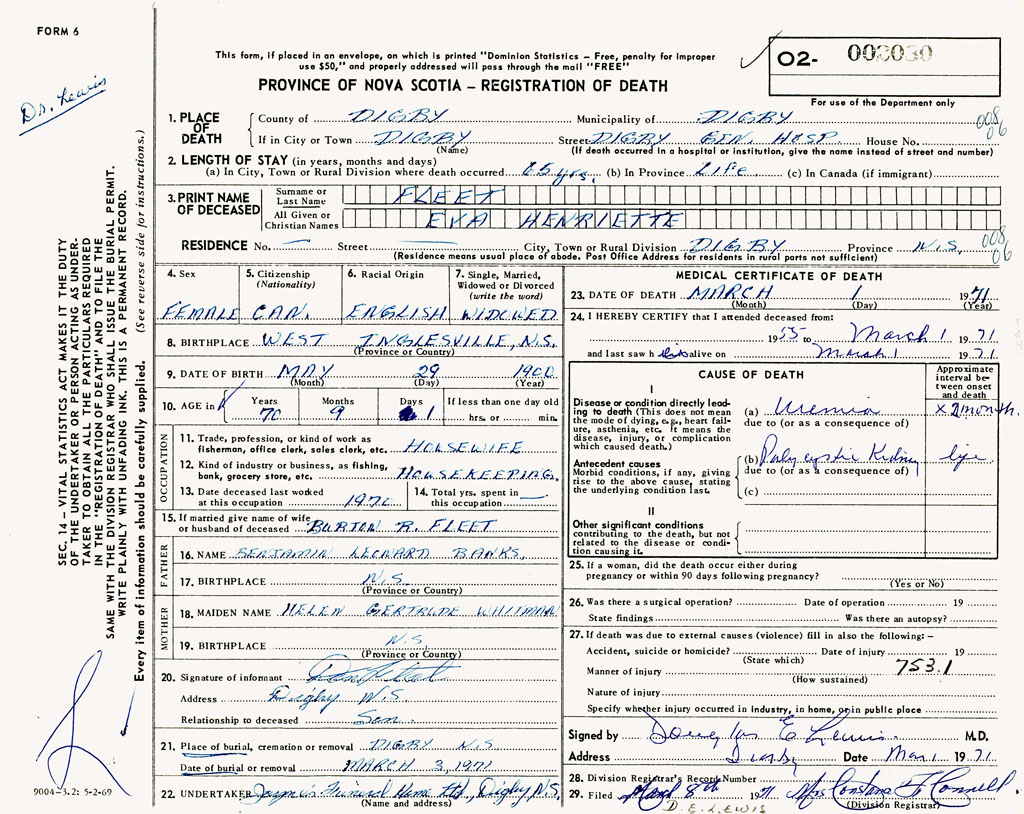PROVINCE OF NOVA SCOTIA — REGISTRATION OF DEATH