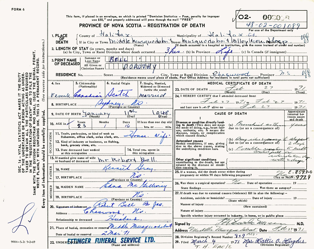 1. PLACE OF DEATH County of Halifax If in City or Town Middle Musquodoboit