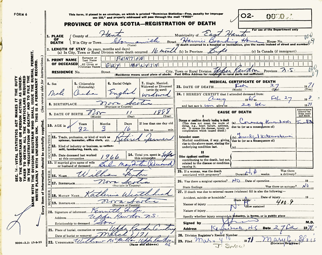 PROVINCE OF NOVA SCOTIA — REGISTRATION OF DEATH