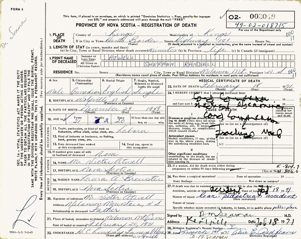 PROVINCE OF NOVA SCOTIA — REGISTRATION OF DEATH