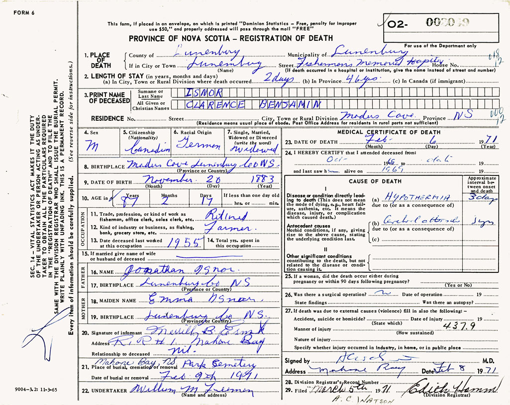 19. BIRTHPLACE Lunenburg Co, NS