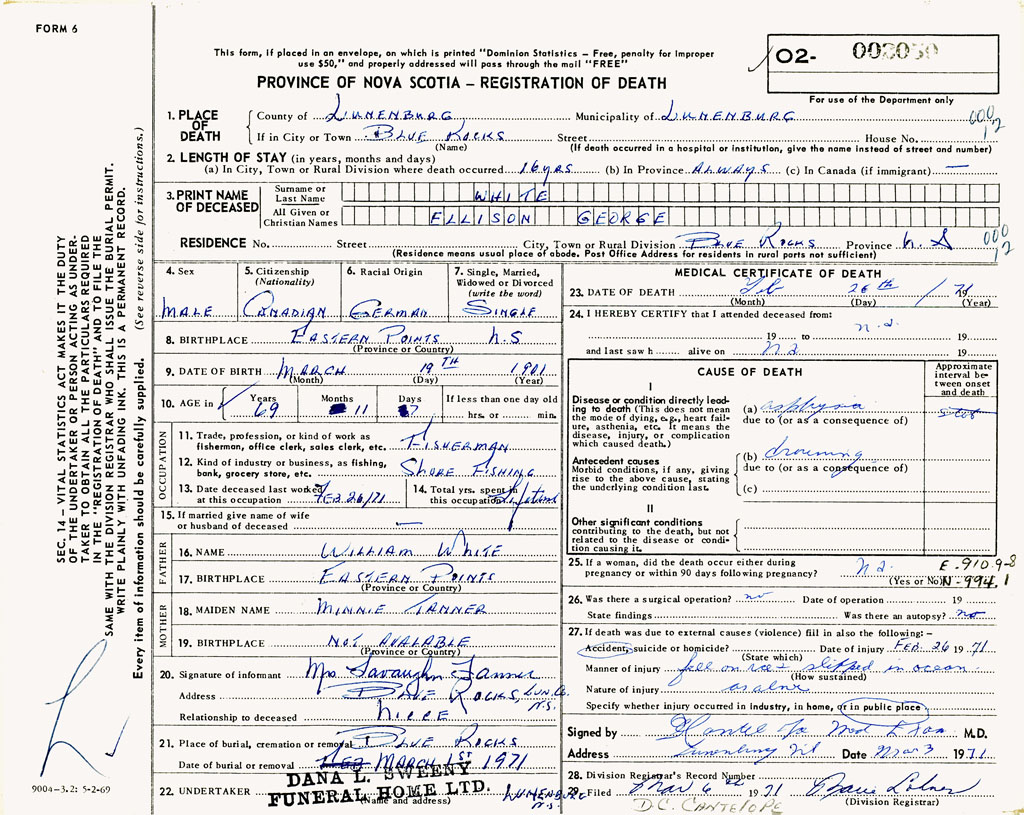 1. PLACE OF DEATH County of Lunenburg If in City or Town Blue Rocks