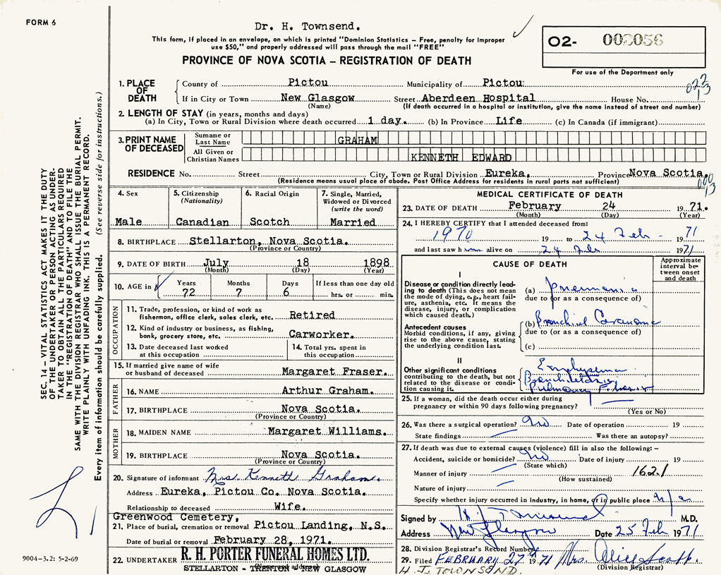 PROVINCE OF NOVA SCOTIA — REGISTRATION OF DEATH
