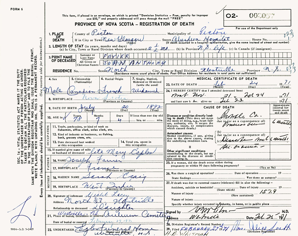 PROVINCE OF NOVA SCOTIA — REGISTRATION OF DEATH