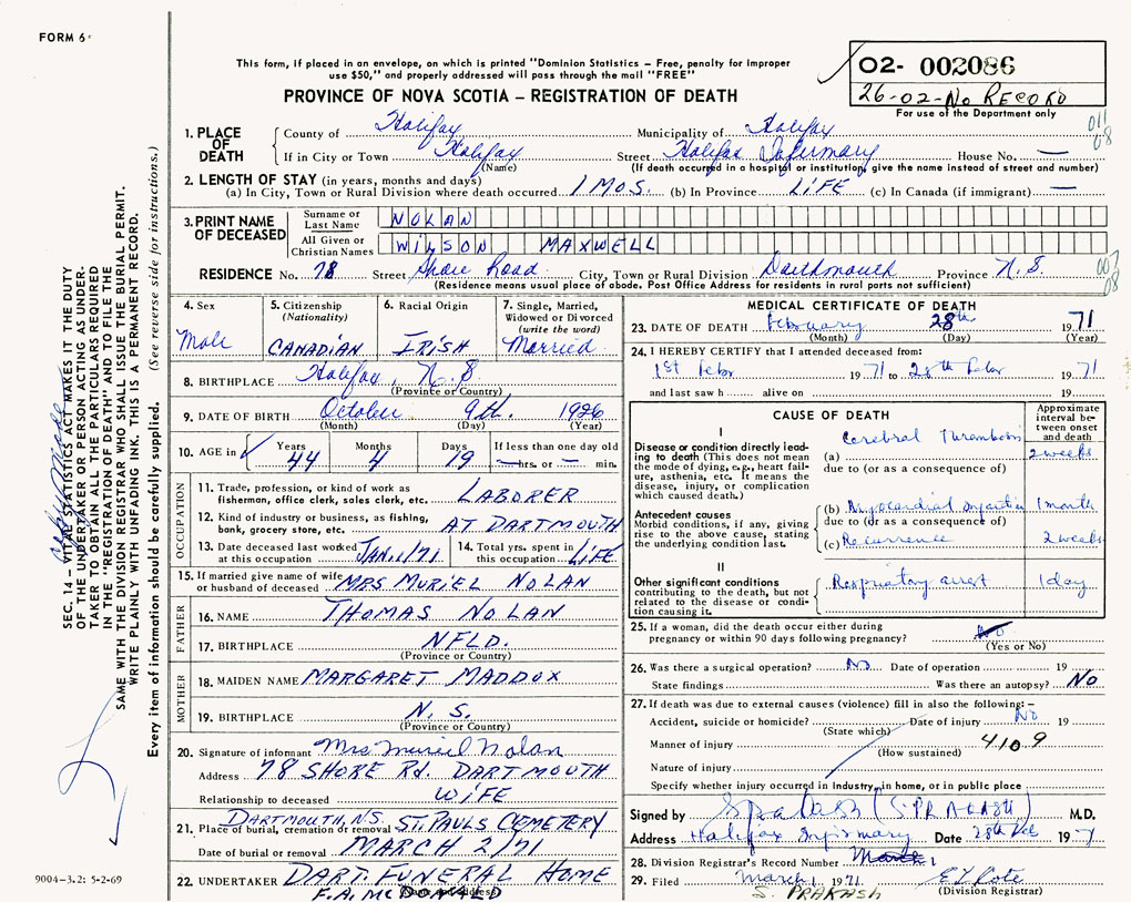 PROVINCE OF NOVA SCOTIA — REGISTRATION OF DEATH