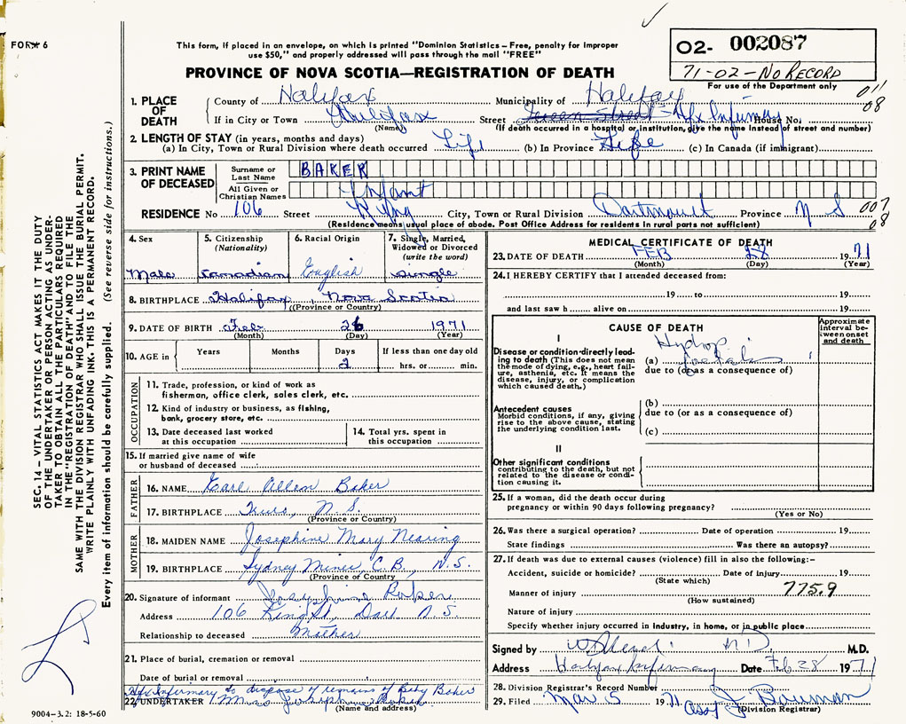 PROVINCE OF NOVA SCOTIA — REGISTRATION OF DEATH