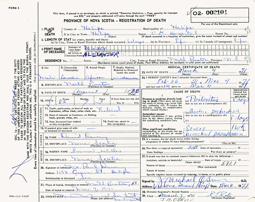 PROVINCE OF NOVA SCOTIA — REGISTRATION OF DEATH