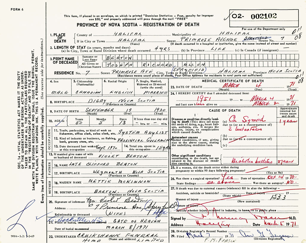 PROVINCE OF NOVA SCOTIA — REGISTRATION OF DEATH