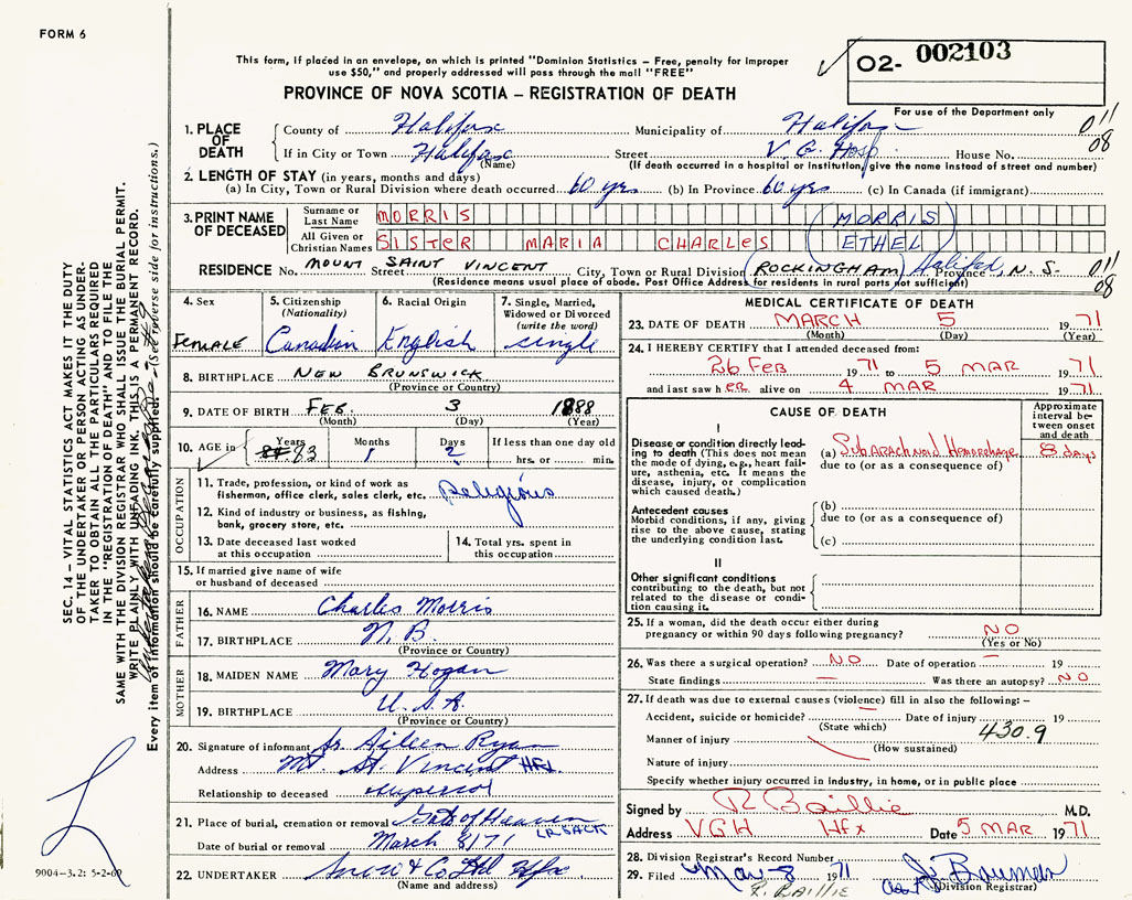 PROVINCE OF NOVA SCOTIA — REGISTRATION OF DEATH