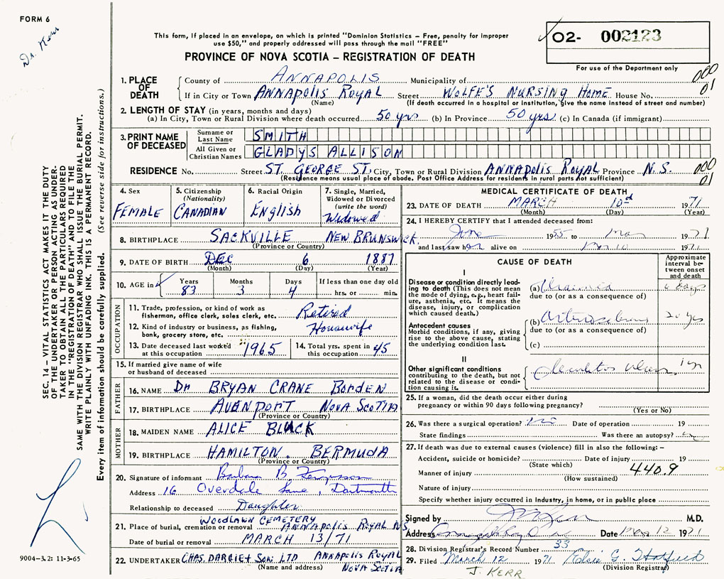 PROVINCE OF NOVA SCOTIA — REGISTRATION OF DEATH