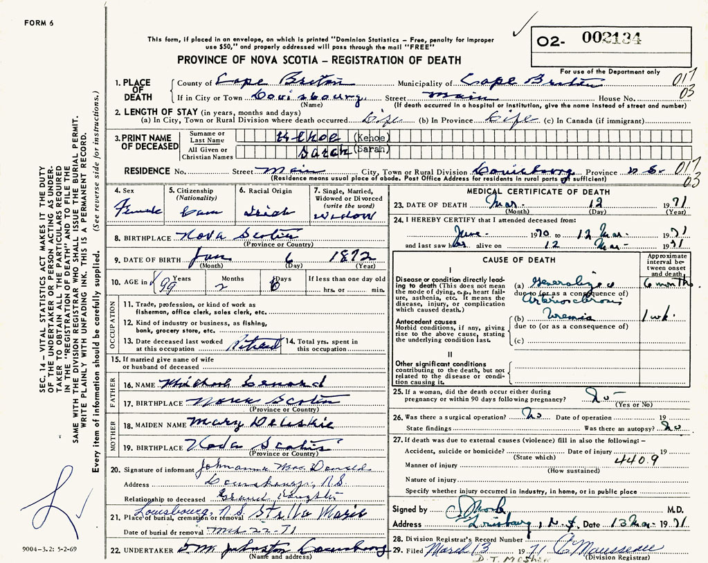 1. PLACE OF DEATH County of Cape Breton If in City or Town Louisbourg