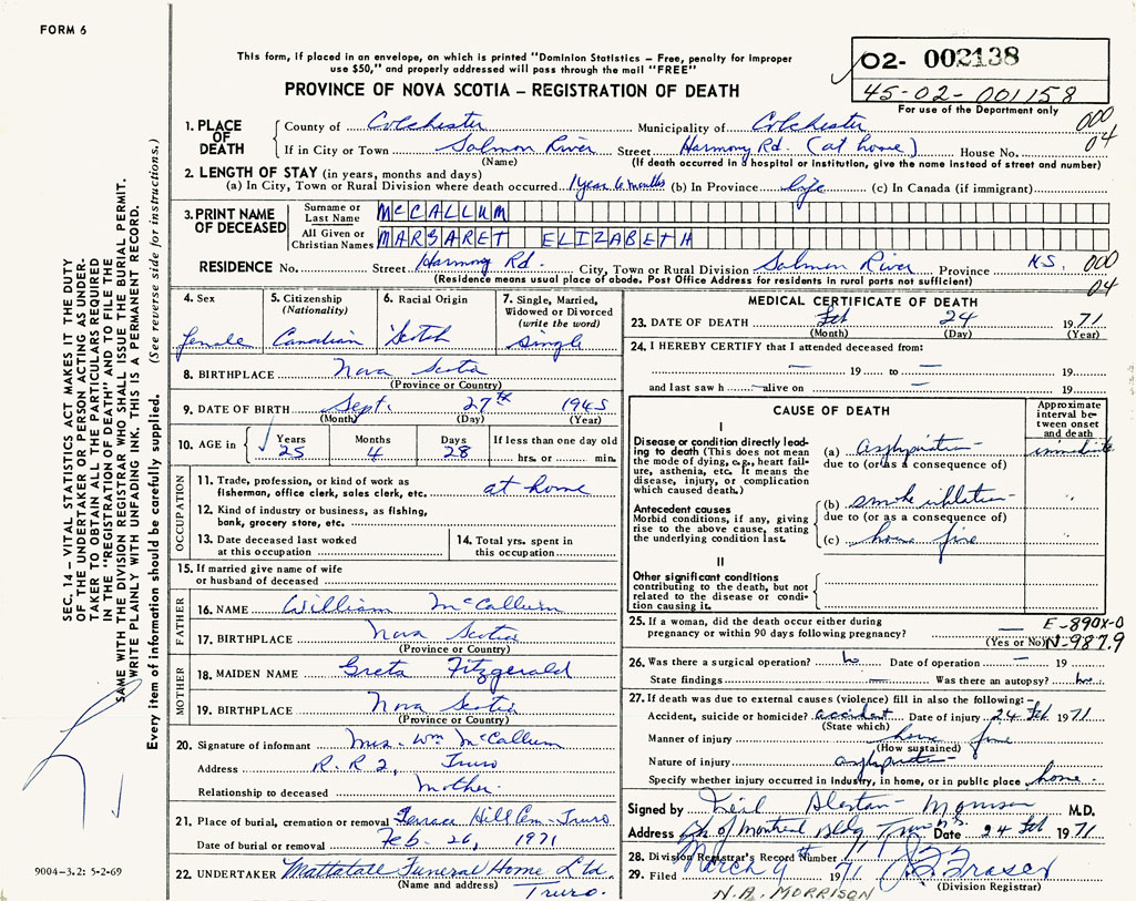 PROVINCE OF NOVA SCOTIA — REGISTRATION OF DEATH