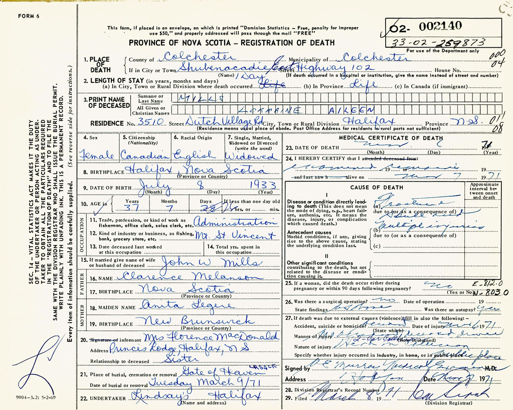 If death occured in a hospital or institution Highway 102, Shubenacadie, NS
