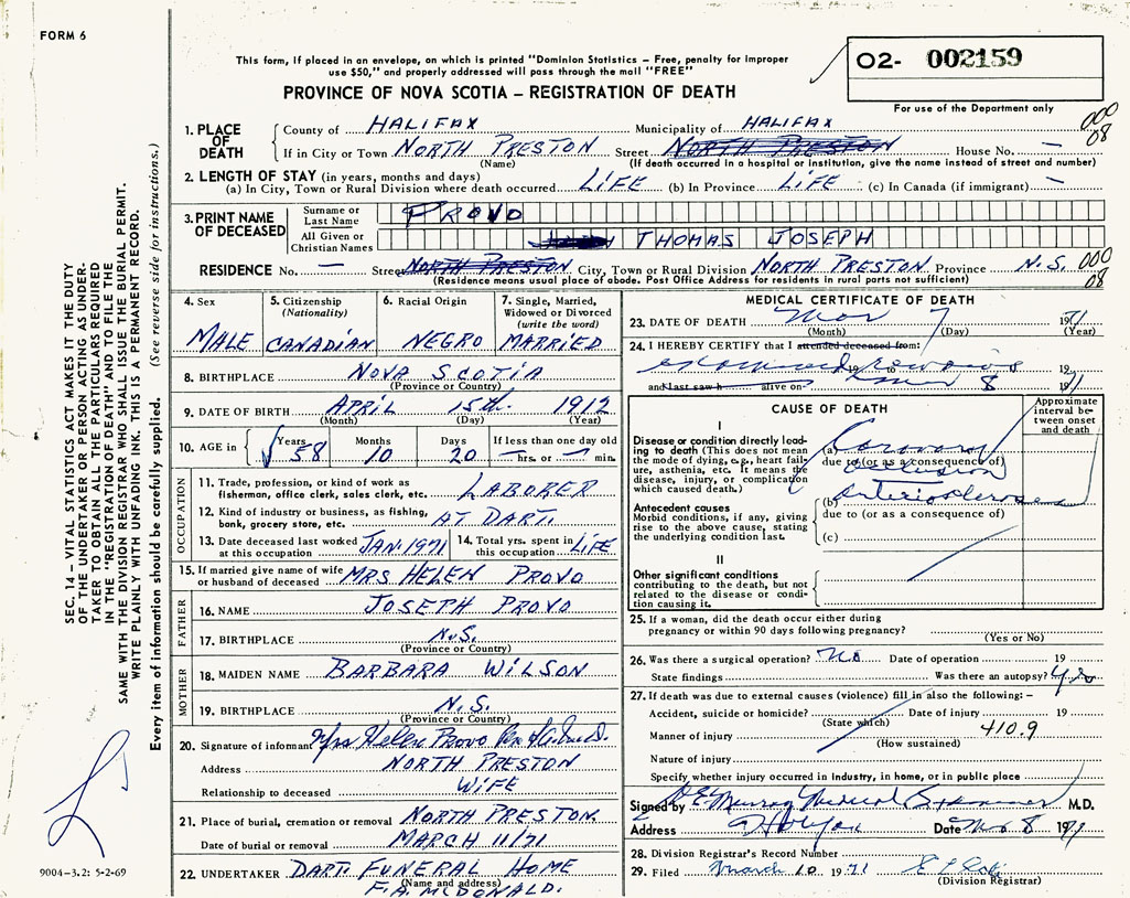 1. PLACE OF DEATH County of Halifax If in City or Town North Preston