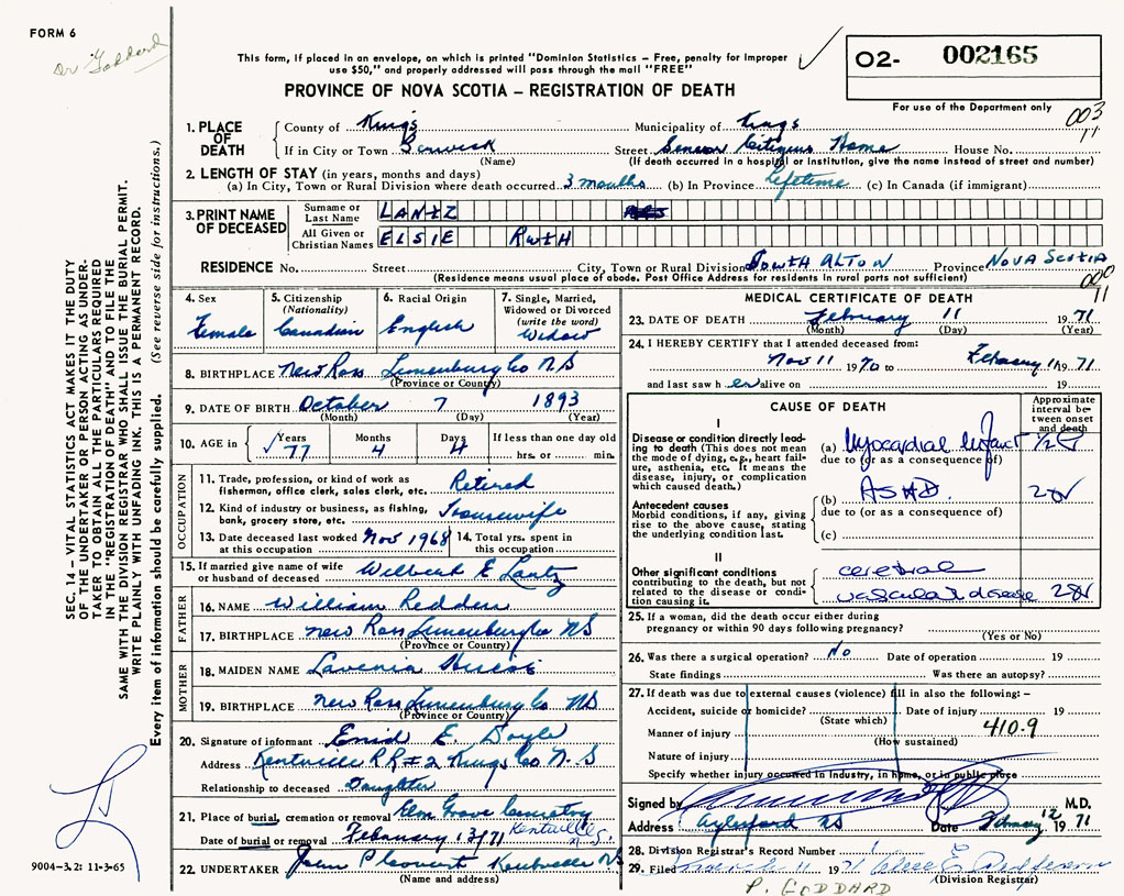 PROVINCE OF NOVA SCOTIA — REGISTRATION OF DEATH