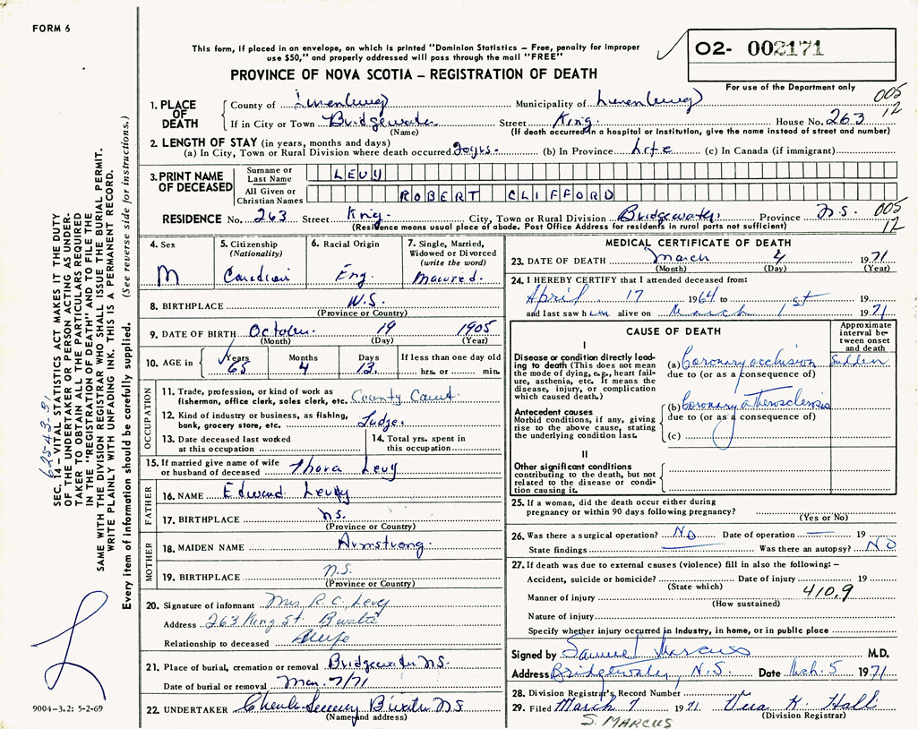 PROVINCE OF NOVA SCOTIA — REGISTRATION OF DEATH
