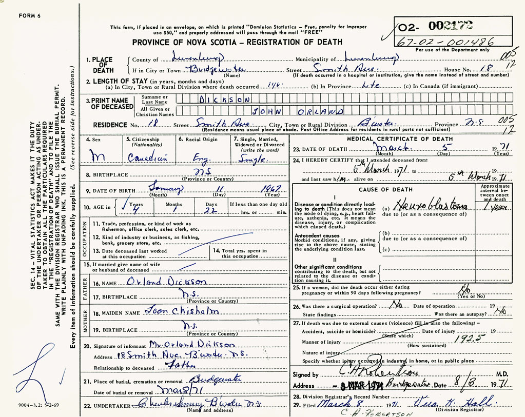 PROVINCE OF NOVA SCOTIA — REGISTRATION OF DEATH