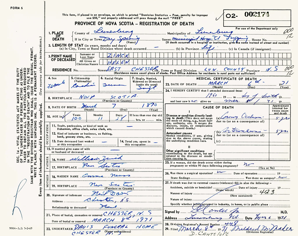 PROVINCE OF NOVA SCOTIA — REGISTRATION OF DEATH