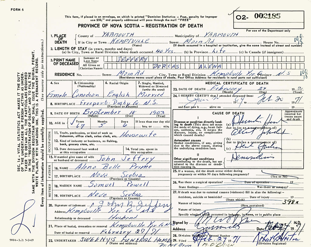 PROVINCE OF NOVA SCOTIA — REGISTRATION OF DEATH