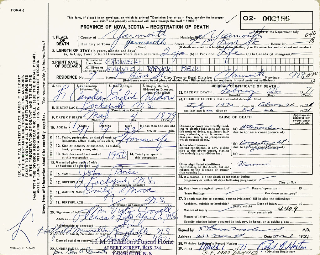 PROVINCE OF NOVA SCOTIA — REGISTRATION OF DEATH
