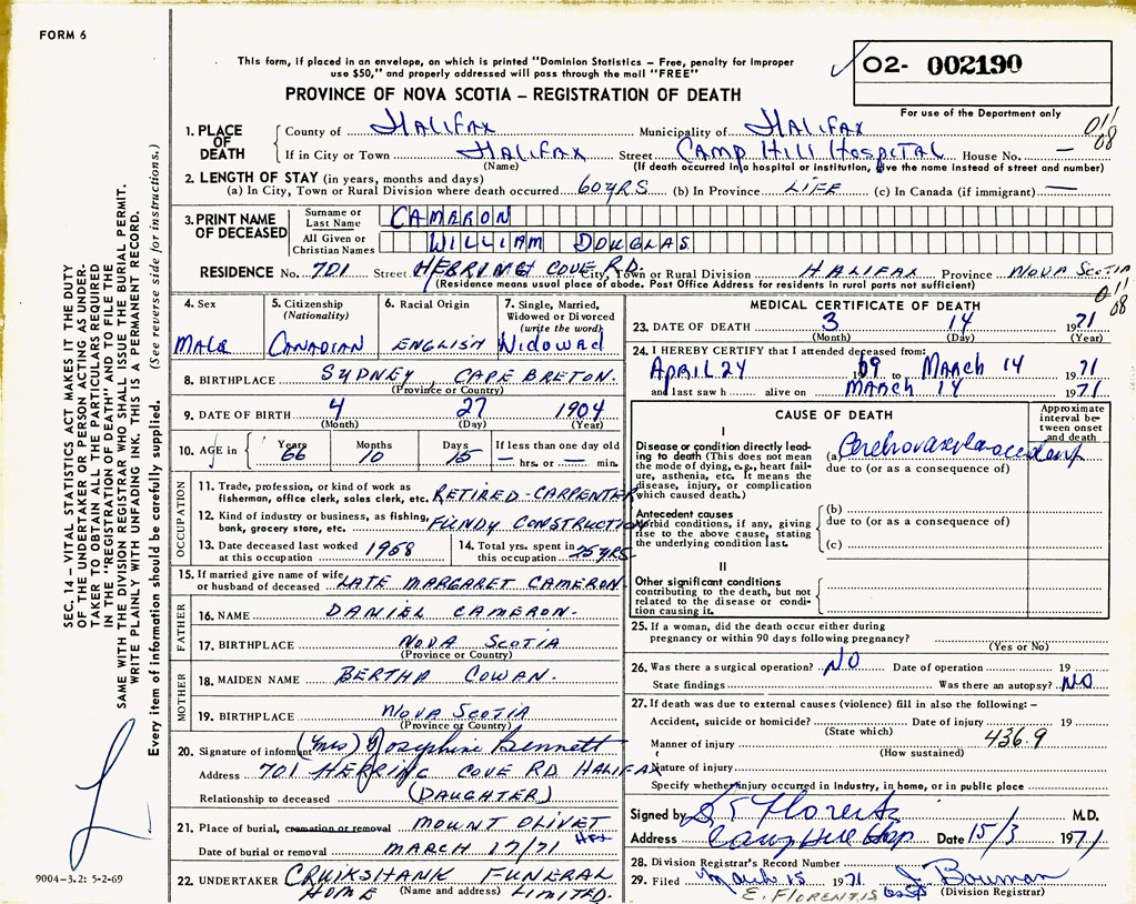 PROVINCE OF NOVA SCOTIA — REGISTRATION OF DEATH
