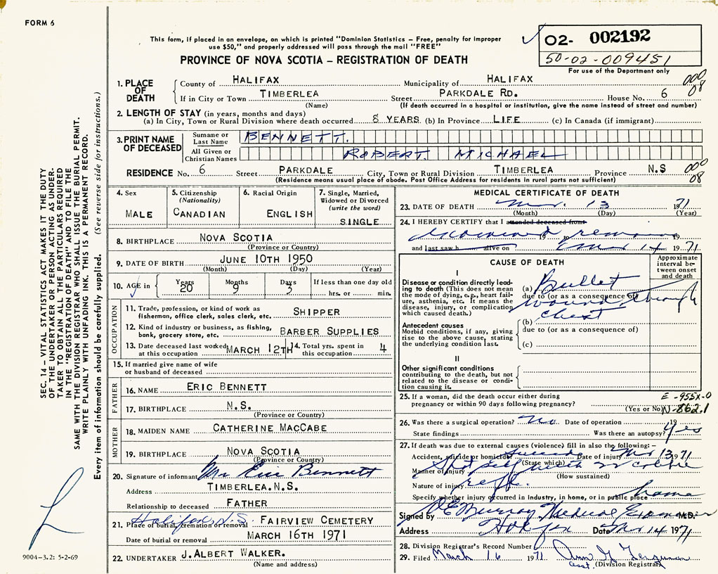 PROVINCE OF NOVA SCOTIA — REGISTRATION OF DEATH
