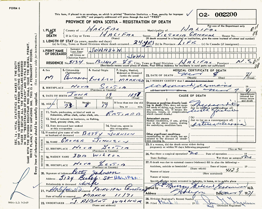 PROVINCE OF NOVA SCOTIA — REGISTRATION OF DEATH