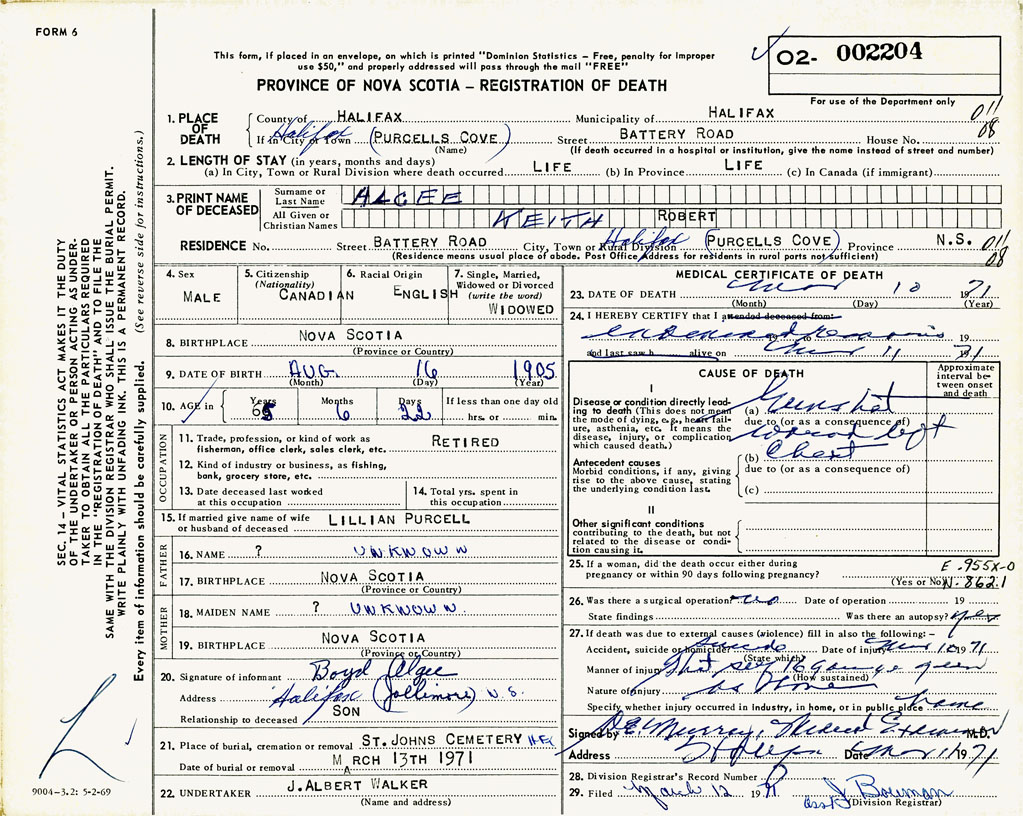 PROVINCE OF NOVA SCOTIA — REGISTRATION OF DEATH