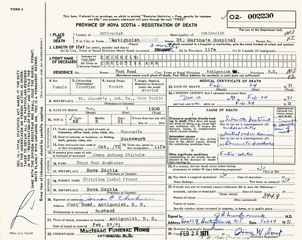 PROVINCE OF NOVA SCOTIA — REGISTRATION OF DEATH
