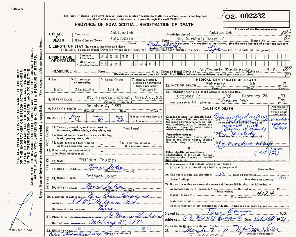 1. PLACE OF DEATH County of Antigonish If in City or Town Antigonish