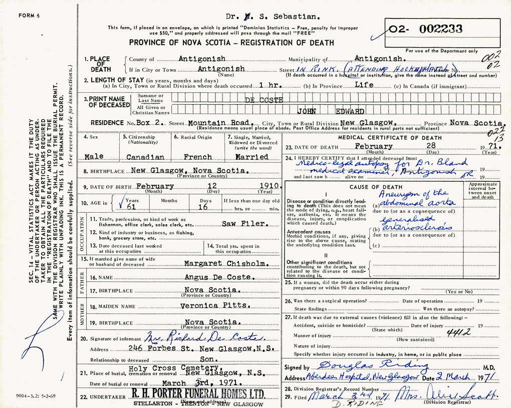 1. PLACE OF DEATH County of Antigonish If in City or Town Antigonish