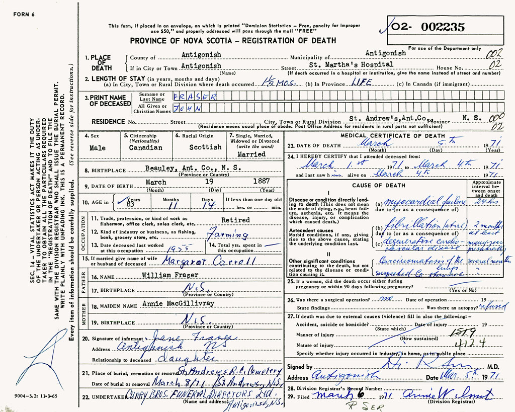 1. PLACE OF DEATH County of Antigonish If in City or Town Antigonish