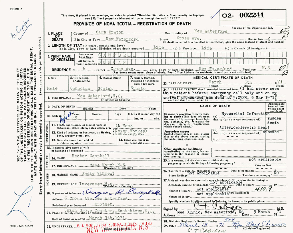 PROVINCE OF NOVA SCOTIA — REGISTRATION OF DEATH