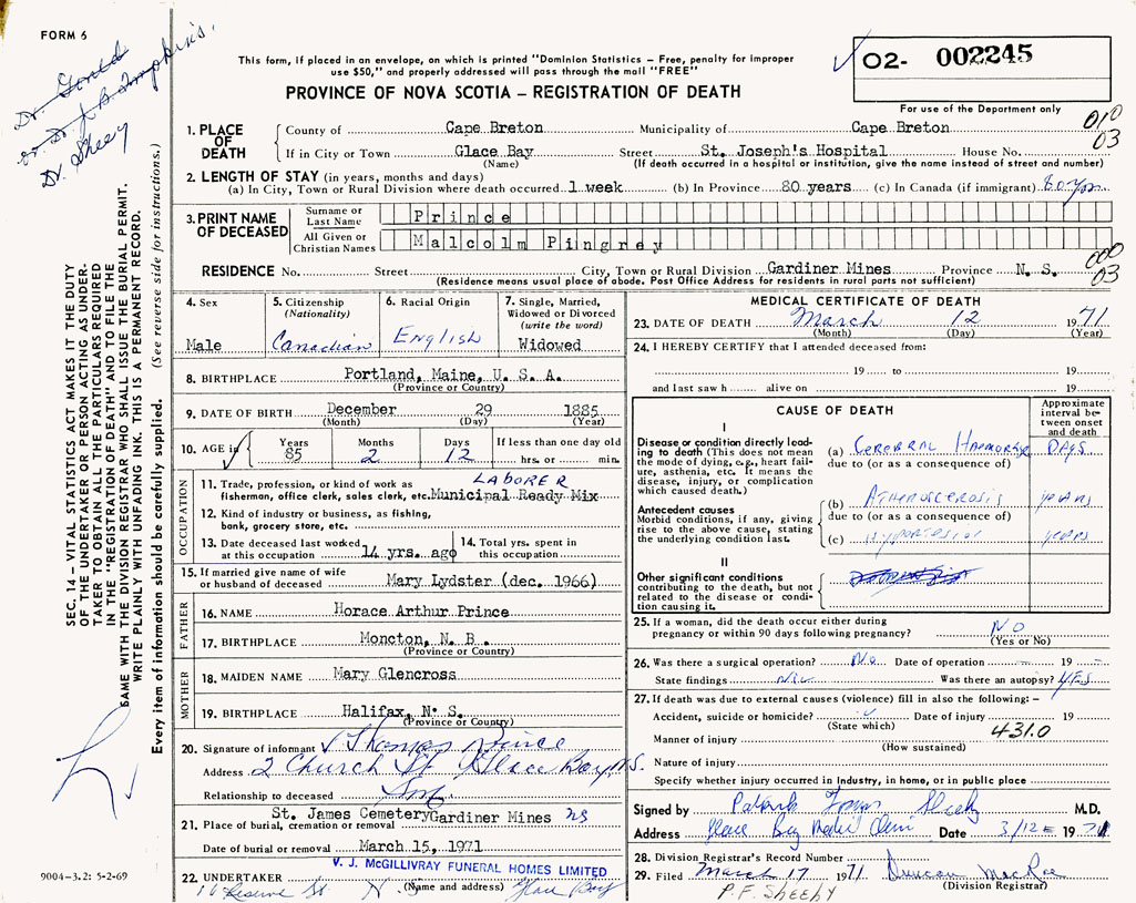 1. PLACE OF DEATH County of Cape Breton If in City or Town Glace Bay