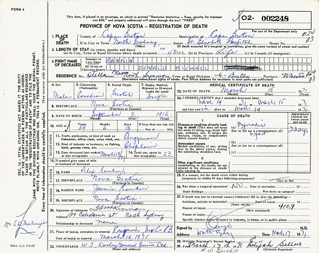 PROVINCE OF NOVA SCOTIA — REGISTRATION OF DEATH