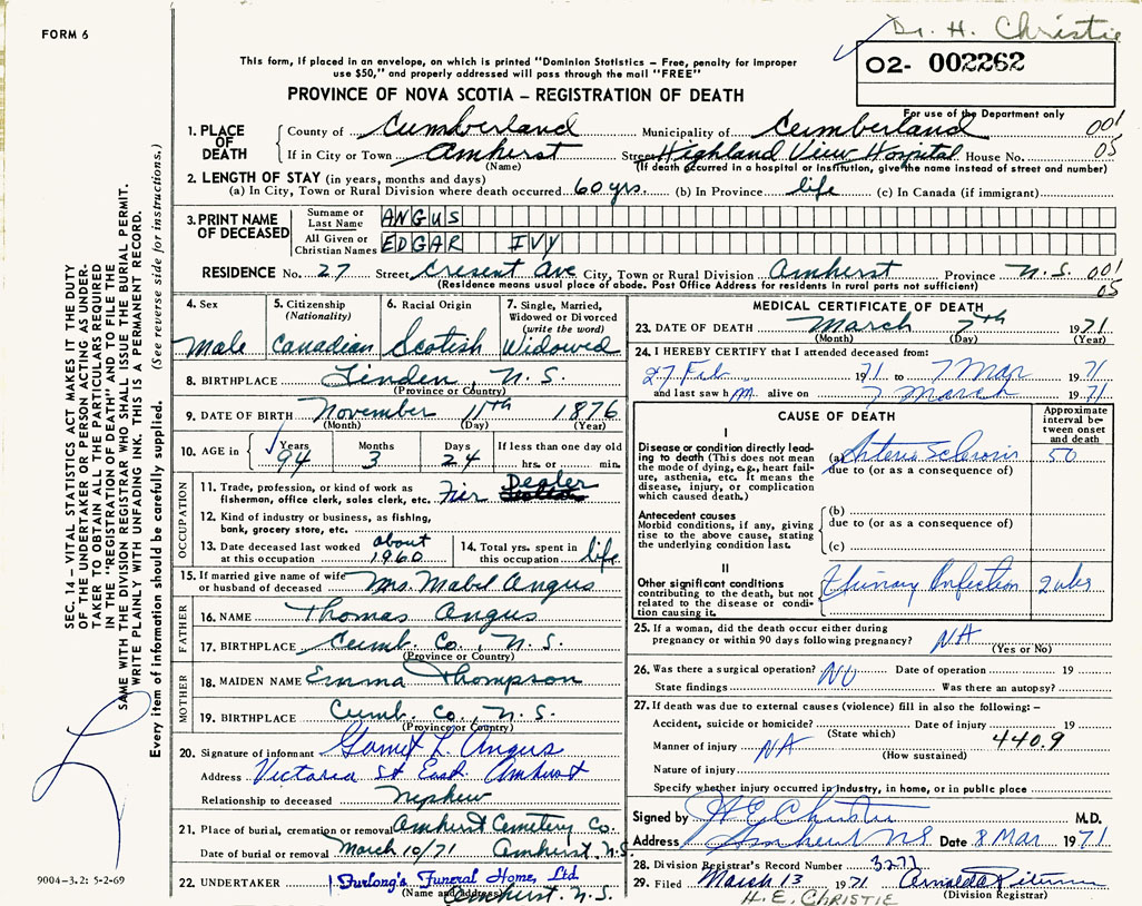PROVINCE OF NOVA SCOTIA — REGISTRATION OF DEATH